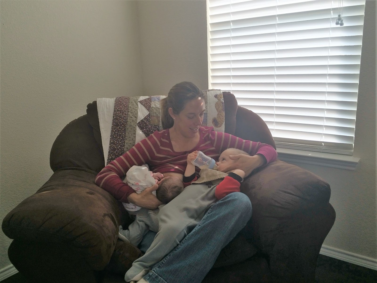 This is how I had to give Sean a bottle and nurse Summer at the same time. I felt guilty that I couldn't hold or cuddle him as much as I used to, That was an adjustment for everyone. We're doing good now. Its not as chaotic. Thank goodness!